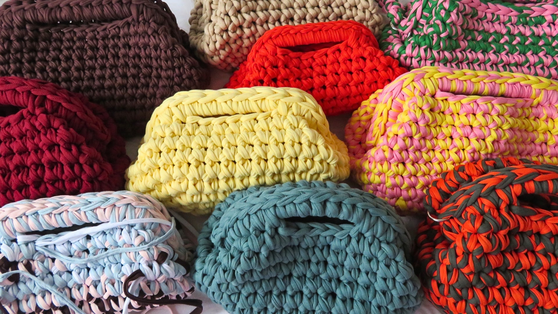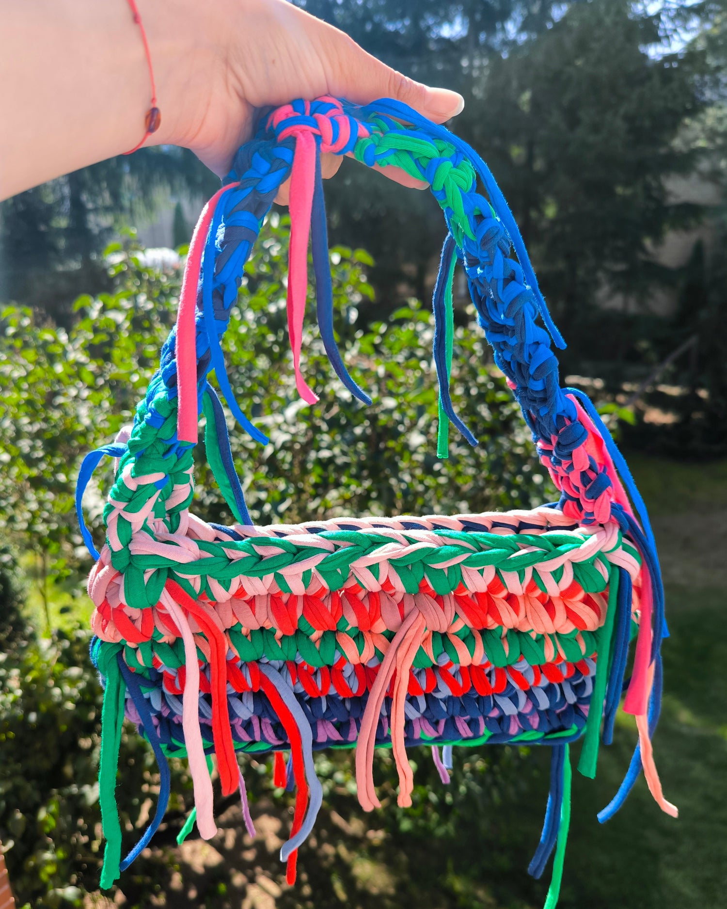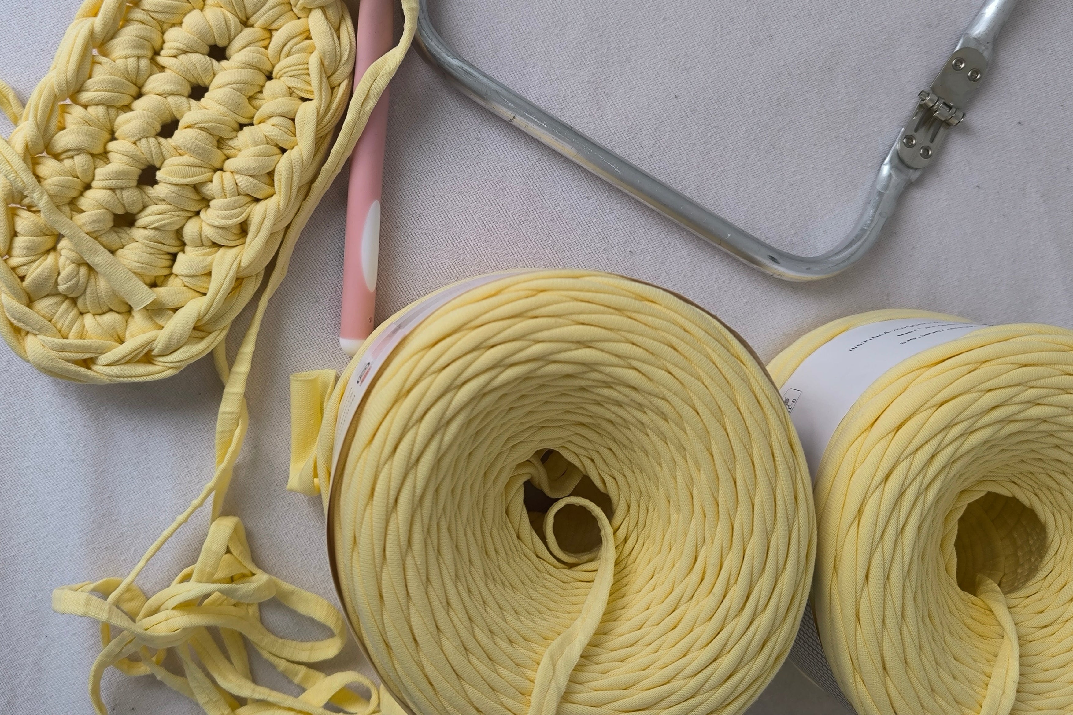 Daugumai savo nertų rankinių naudoju trikotažines virveles, gaminamas iš perdirbtų ar perteklinių audinių likučių. Dažniausiai tai medvilnė arba medvilnės mišiniai - tvirti, minkšti ir malonūs liesti. Tokia žaliava suteikia antrą gyvenimą tekstilei, o kiekvienai rankinei unikalų charakterį.