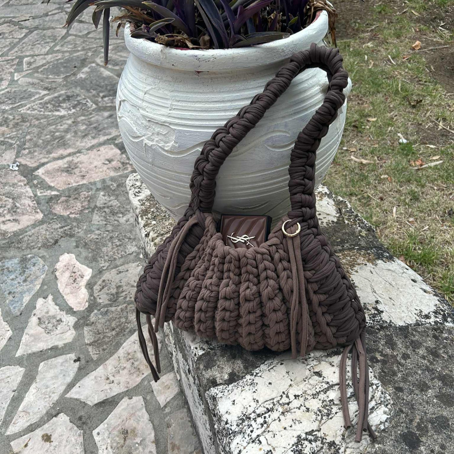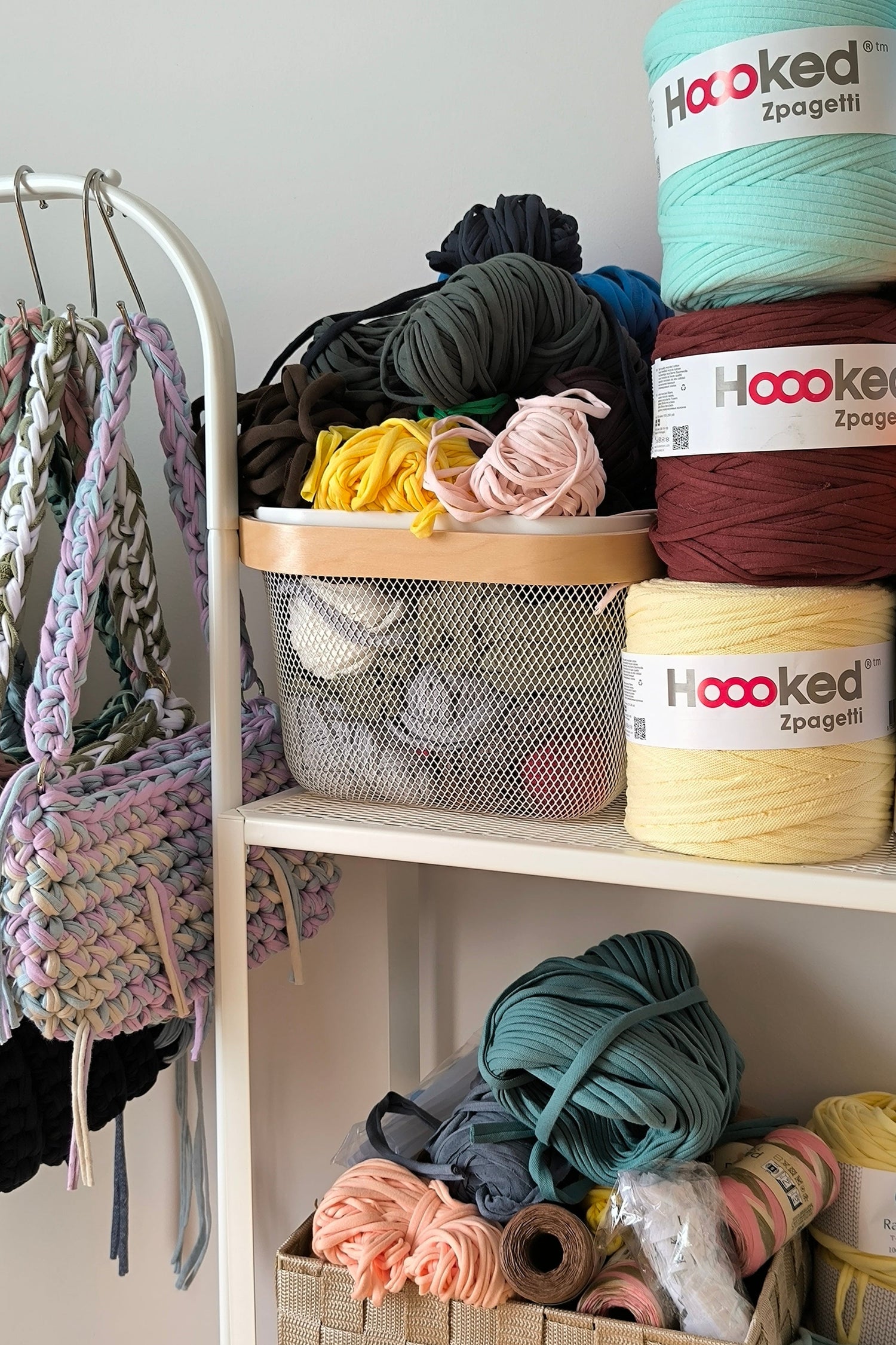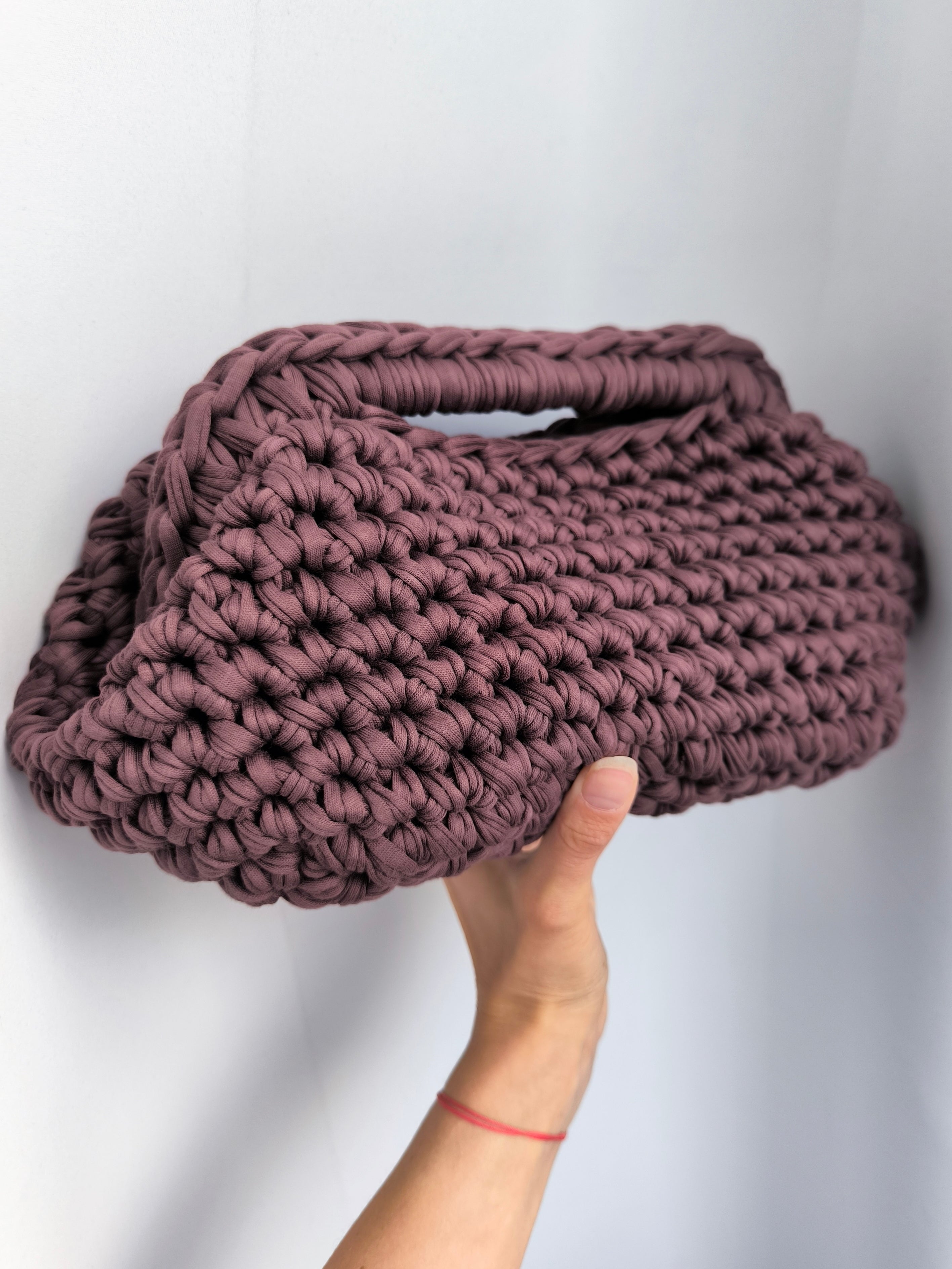 Daugumai savo nertų rankinių naudoju trikotažines virveles, gaminamas iš perdirbtų ar perteklinių audinių likučių. Dažniausiai tai medvilnė arba medvilnės mišiniai - tvirti, minkšti ir malonūs liesti. Tokia žaliava suteikia antrą gyvenimą tekstilei, o kiekvienai rankinei unikalų charakterį.
