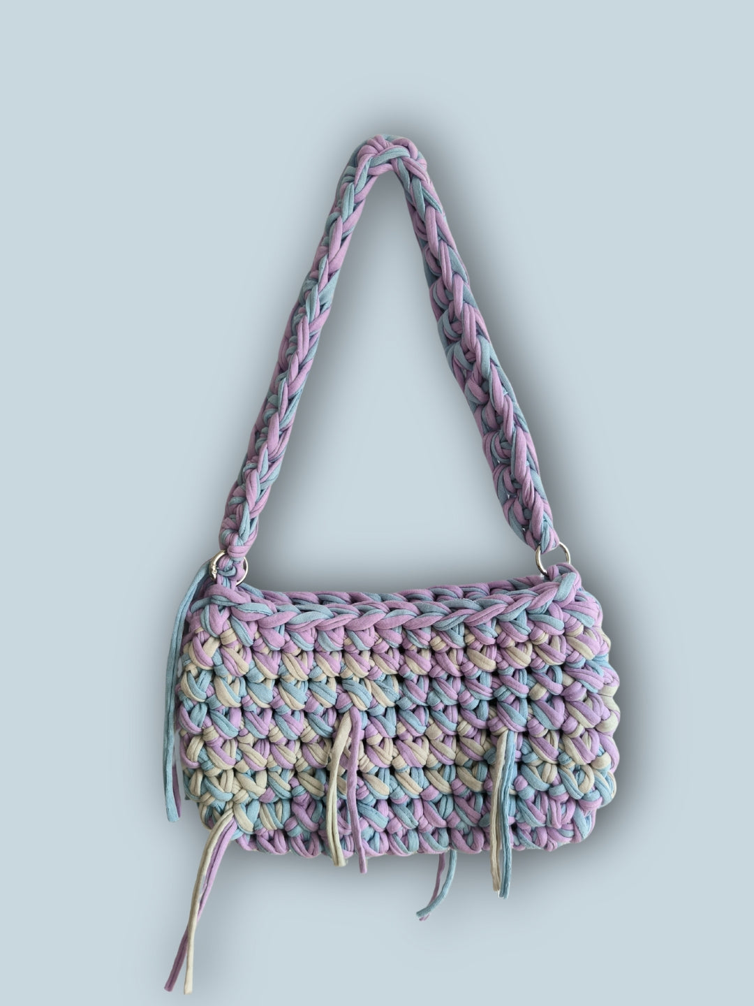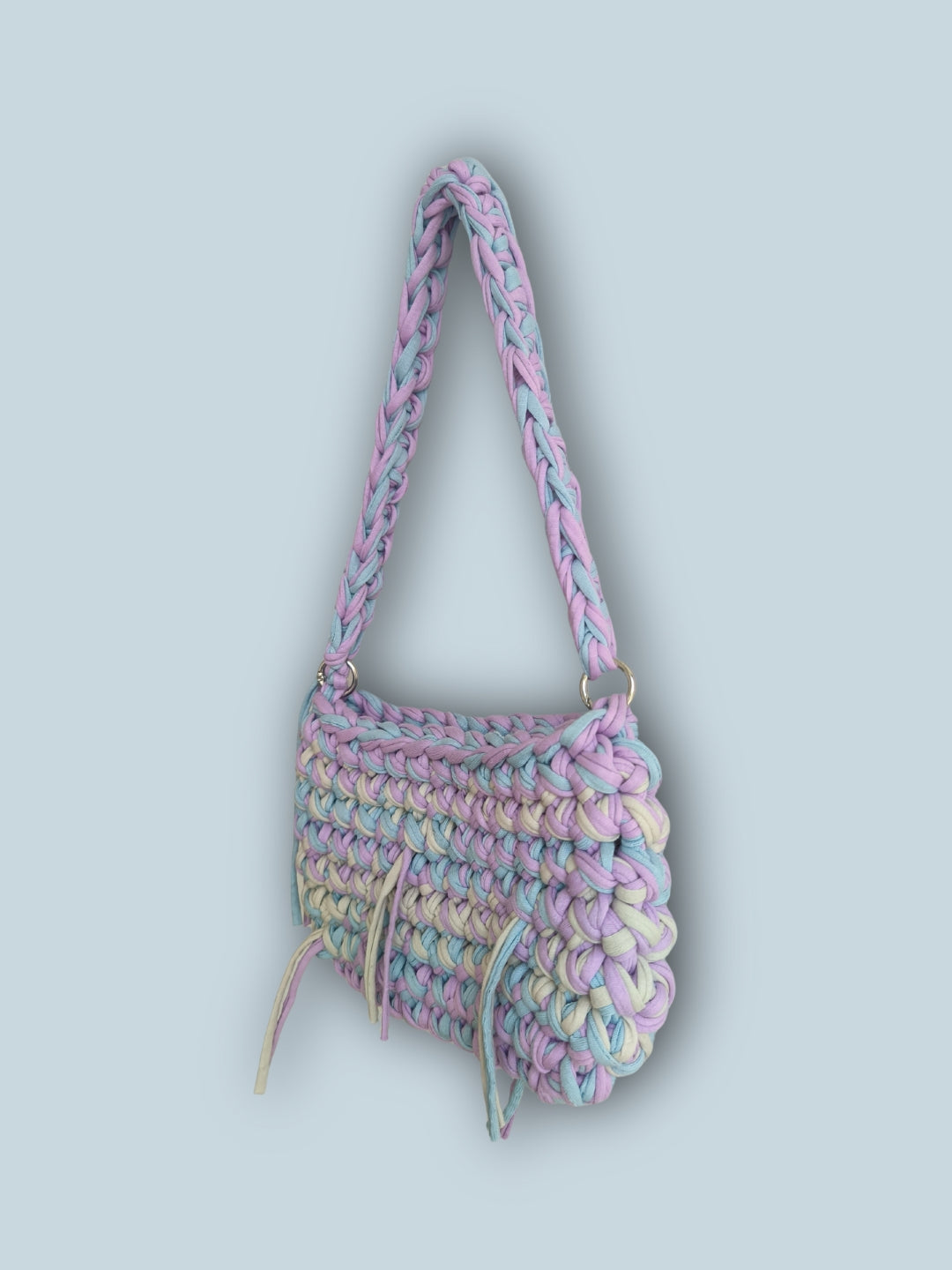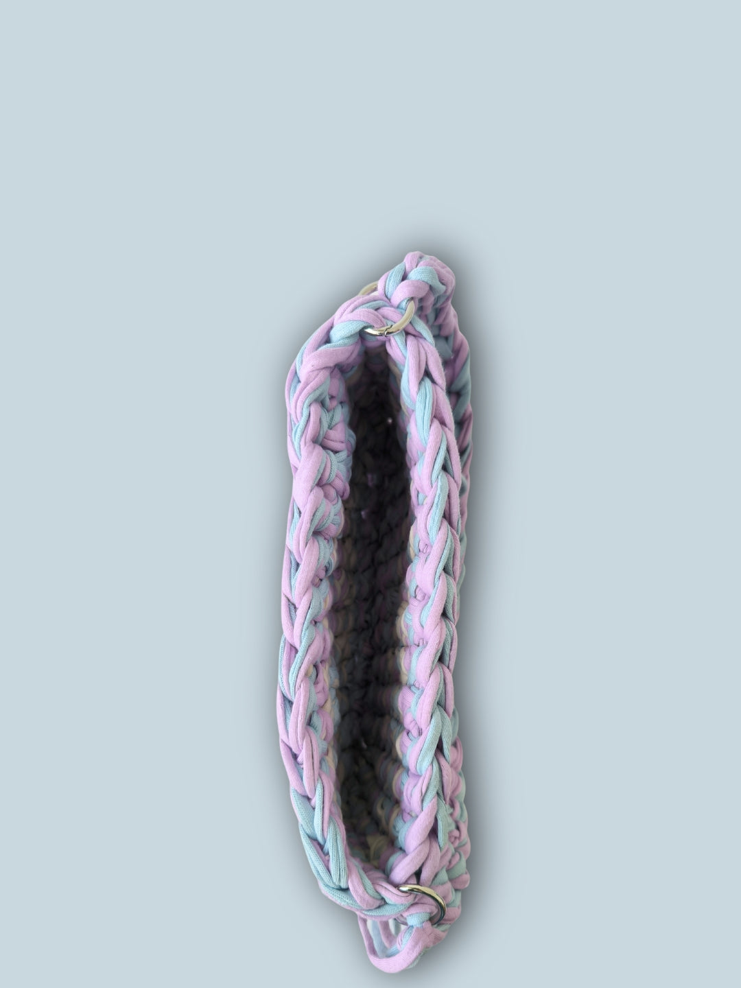 Kompaktiška, bet išraiškinga rankinė nunerta iš dvigubos, perdirbtos tekstilės virvelės – tvirta, stilinga ir draugiška aplinkai.