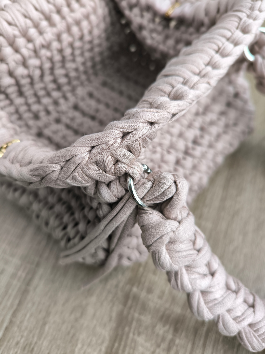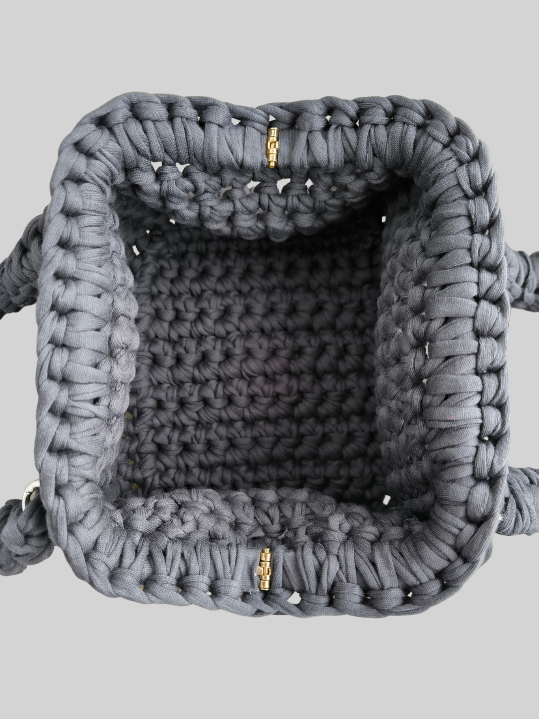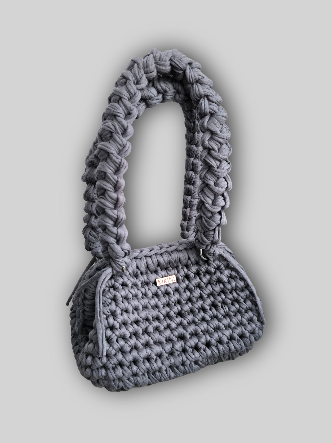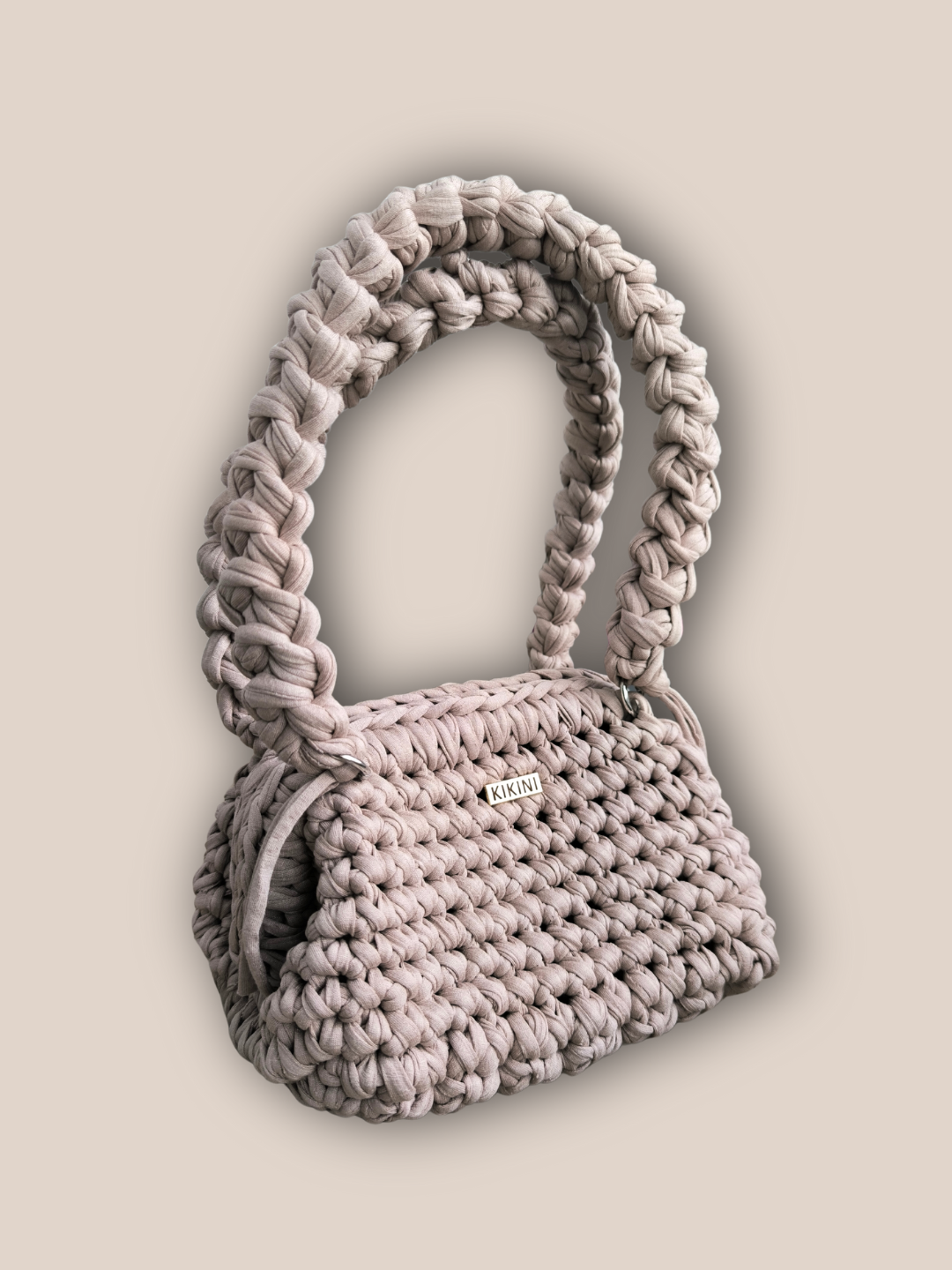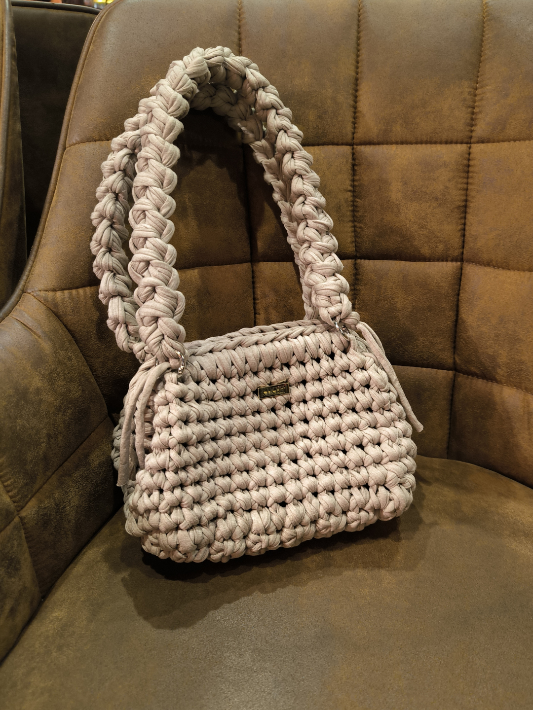 Subtili ir funkcionali, ši nerta delninė puikiai dera tiek prie kasdienio, tiek prie šventinio įvaizdžio. Nunerta iš perdirbtos medvilnės virvelės, ji išsiskiria savo tekstūra ir tvirtumu. Nuimamos rankenos suteikia lankstumo - rankinę gali nešioti rankoje kaip delninę arba su prisegtomis rankenomis ant peties.