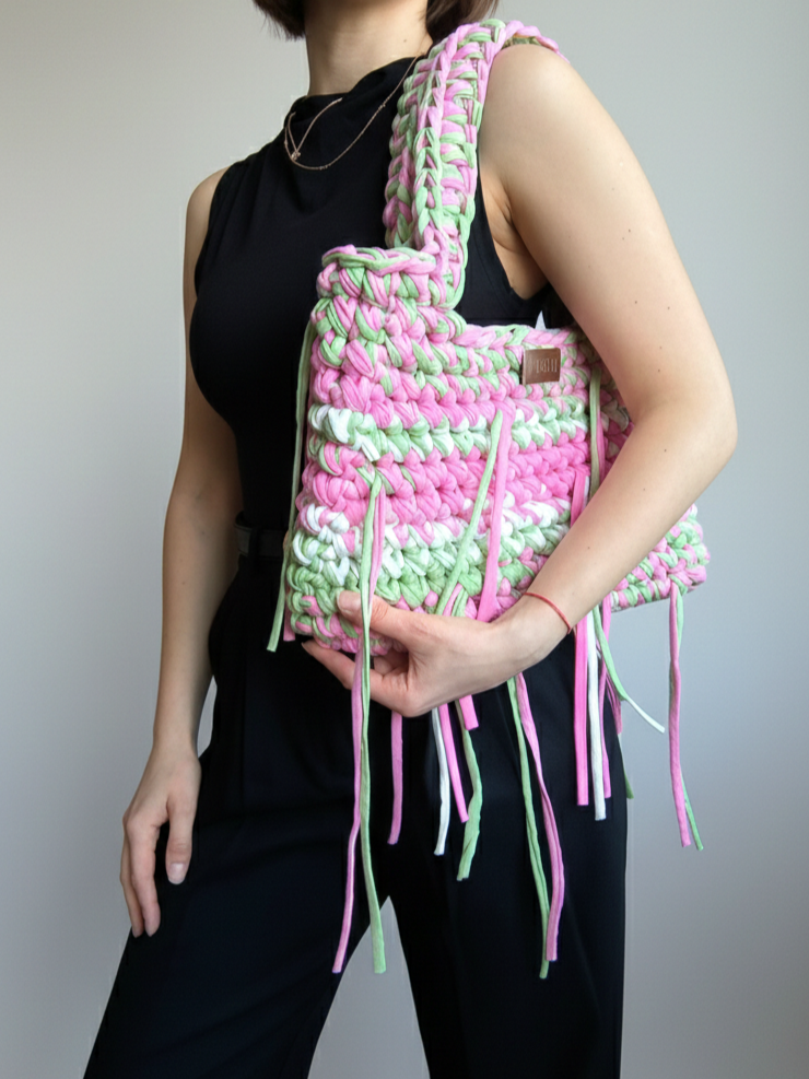 Erdvi nerta rankinė iš dvigubos perdirbtos tekstilės virvelės – tvirta, stilinga ir patogi nešioti.