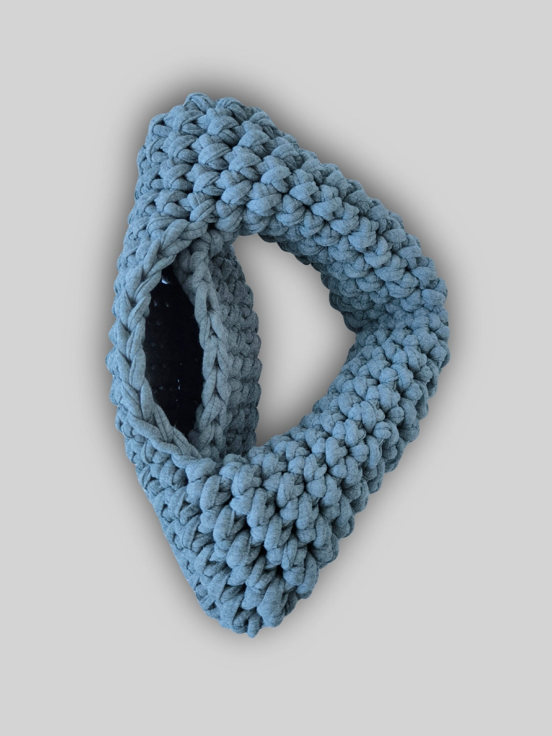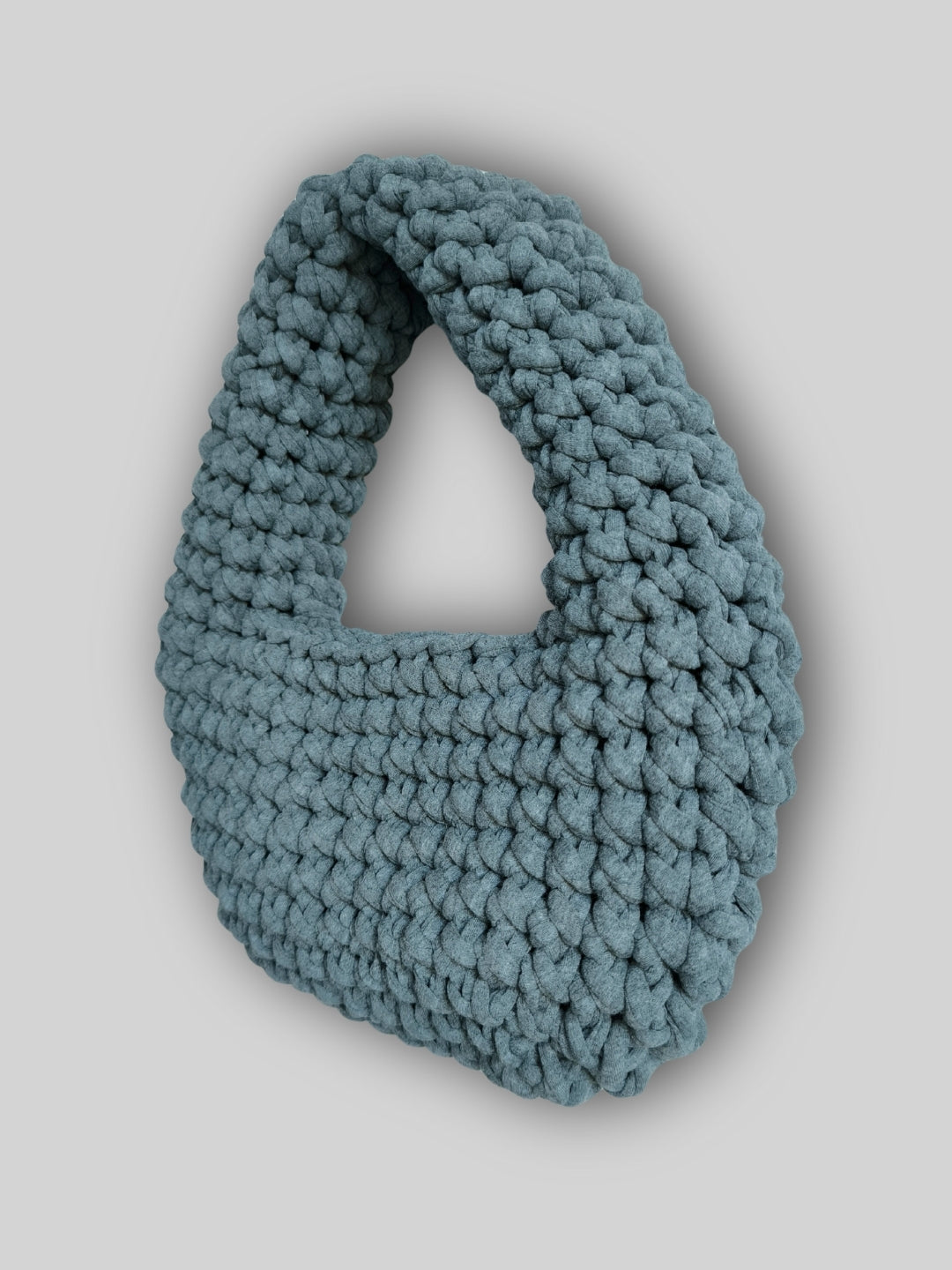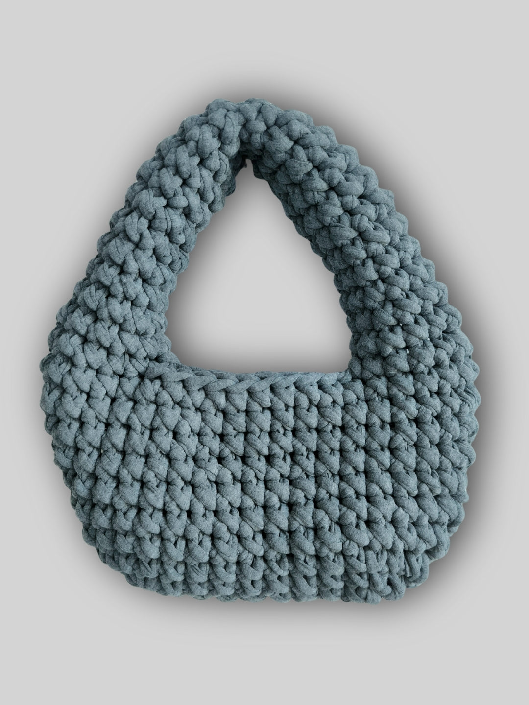 Stilinga ir itin talpi rankinė nunerta iš perdirbtos tekstilės virvelės – tvirta, patvari ir draugiška aplinkai. Išsiskiria savo stora rankena, kuri patogiai laikosi ant peties.