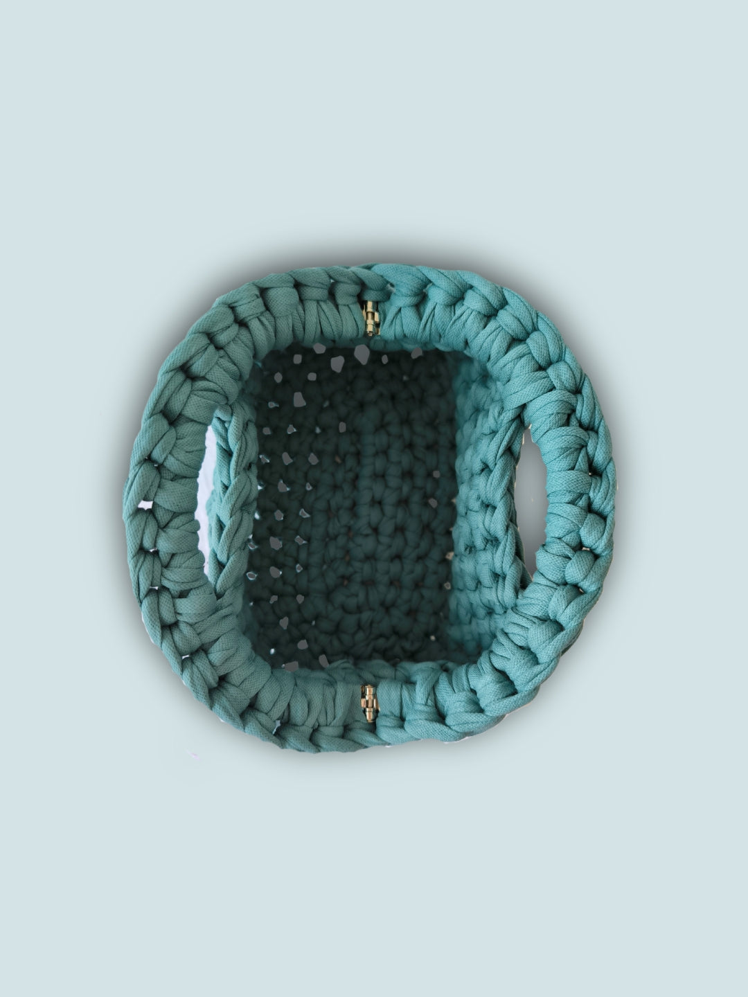Elegantiška, bet kartu žaisminga delninė nunerta iš perdirbtos medvilnės virvelės. Metalinis rėmelis su užsegimu suteikia retro žavesio, o ergonomiškas dizainas leidžia patogiai laikyti rankoje.