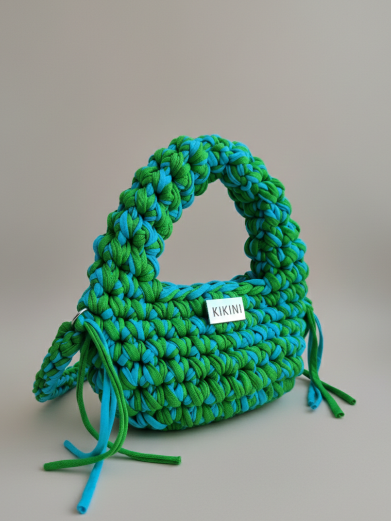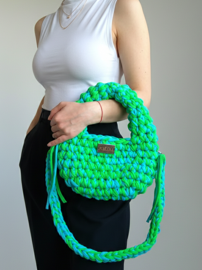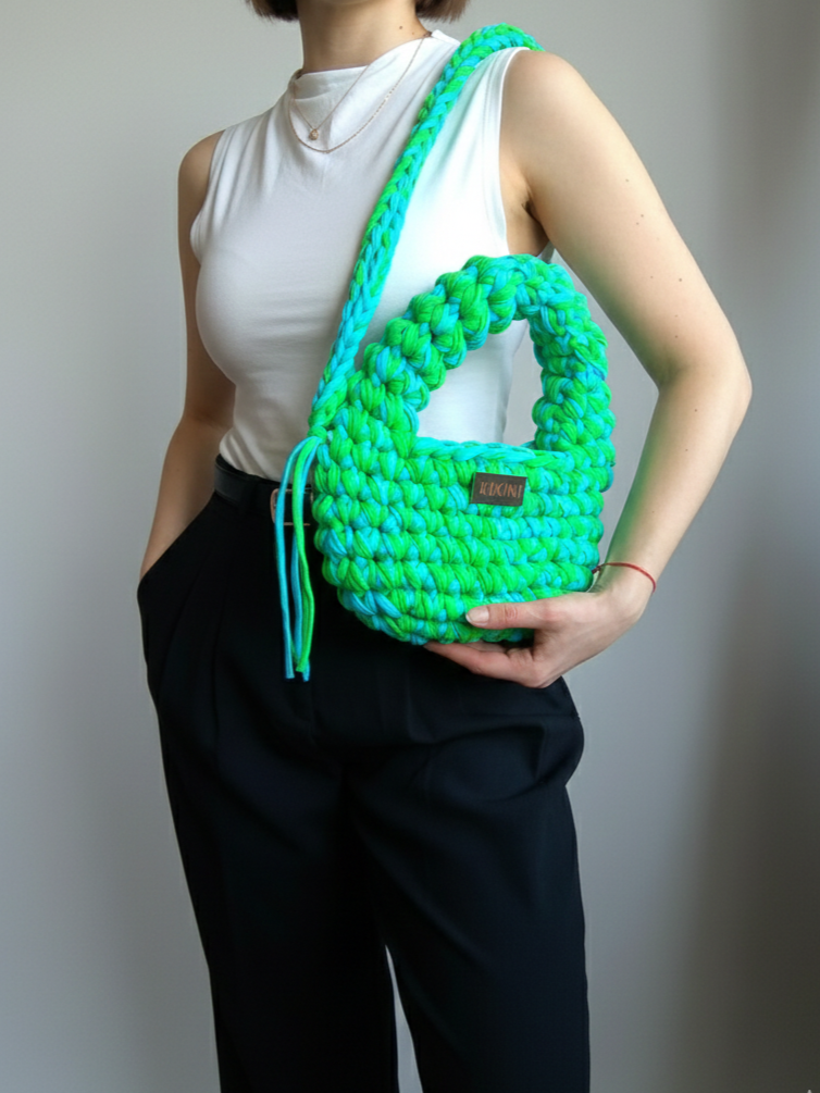 Stilinga rankinė nunerta iš dvigubos perdirbtos tekstilės virvelės – tvirta, patvari ir draugiška aplinkai.